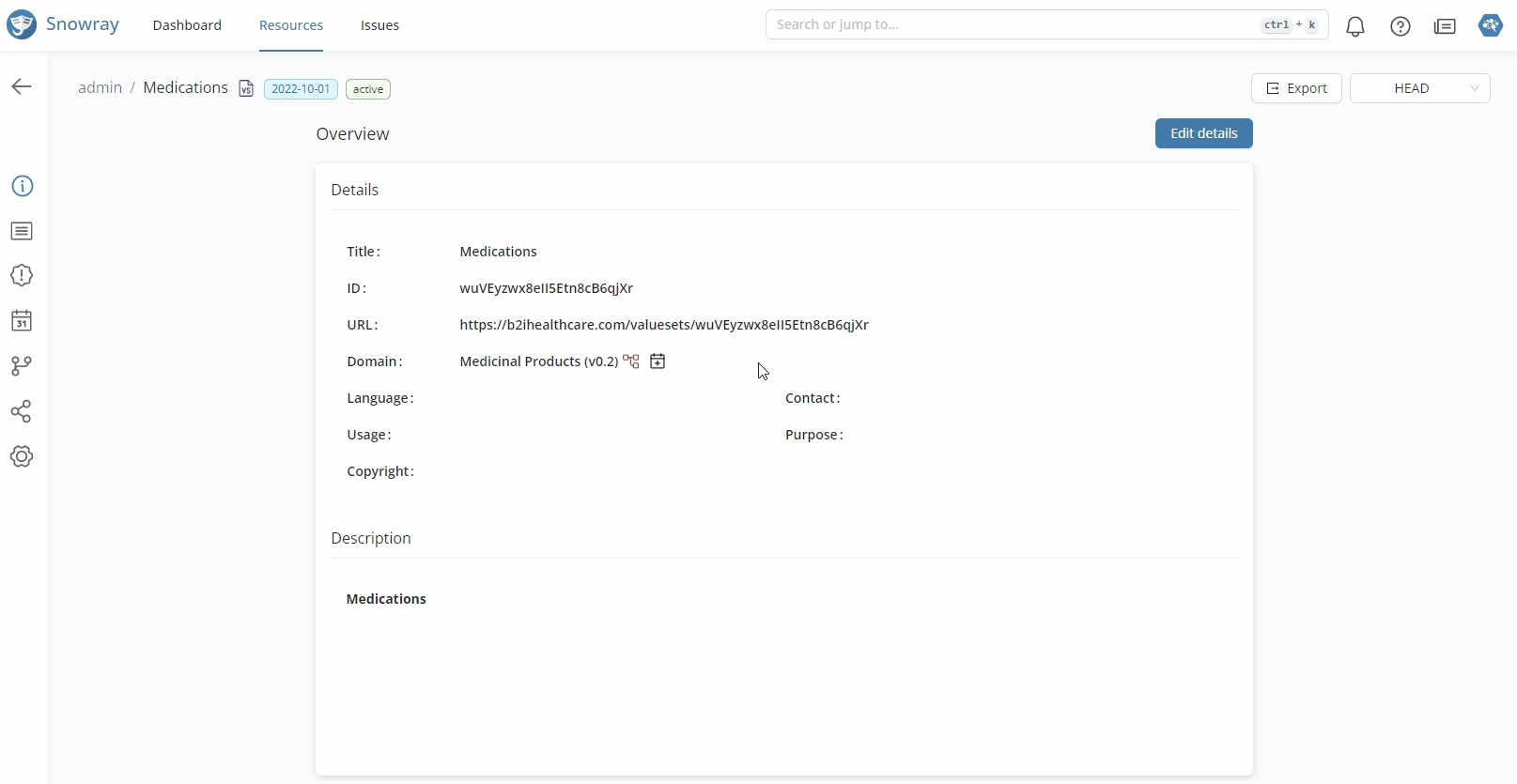 Selecting a Value Set from the resources navigates users to its Overview tab.