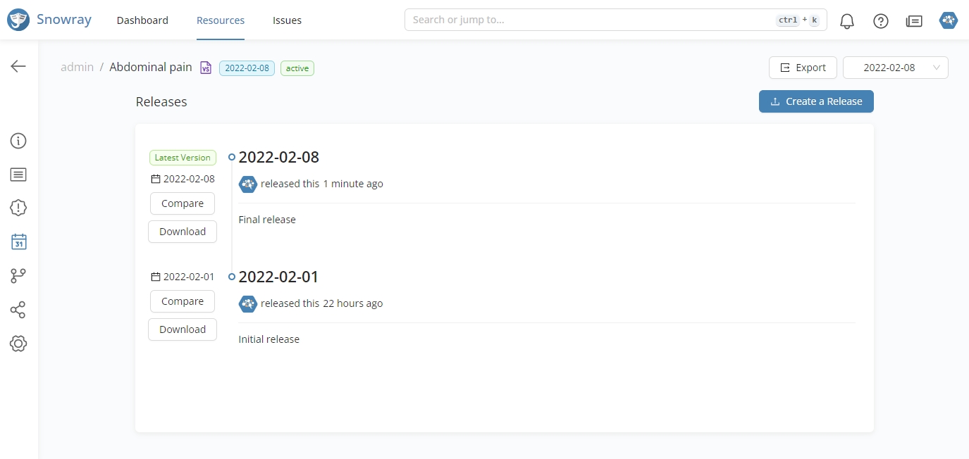 (if specified upon creation). In addition, a green tag on the left-hand side of the timeline indicates the latest release.