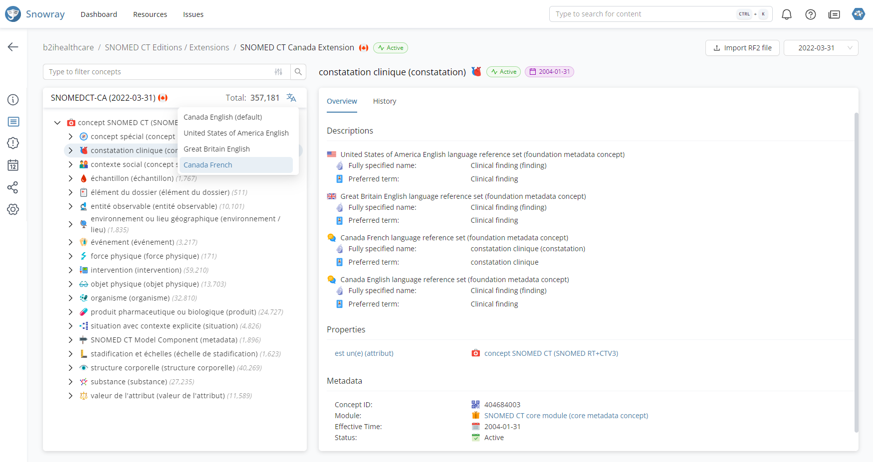 Additionally, when selected in the hierarchy, concepts will be displayed in the preferred language in the concept Overview tab header as well.
