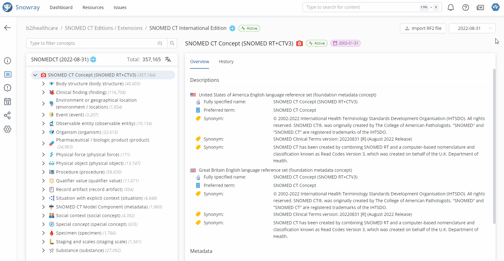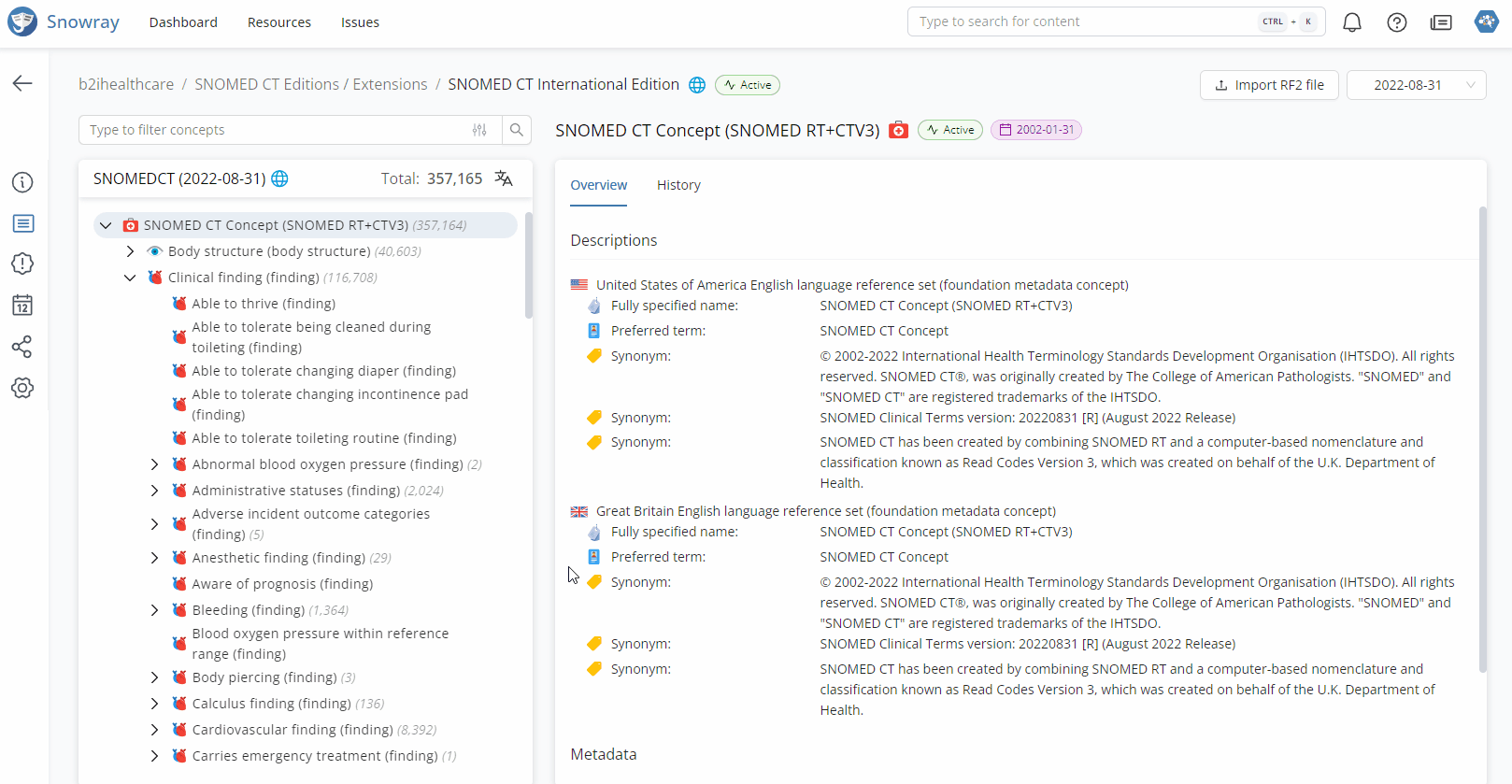 Besides supporting national and international Terminology Standards, such as SNOMED CT, ICD-10, or LOINC, Snowray also supports the creation and maintenance of Custom Code Systems.