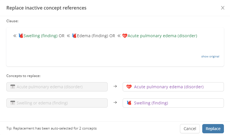Replacements are auto-selected in case of available inactivation replacement associations. Otherwise, users can pick their preferred concepts using the quick search widget on the right-hand side.