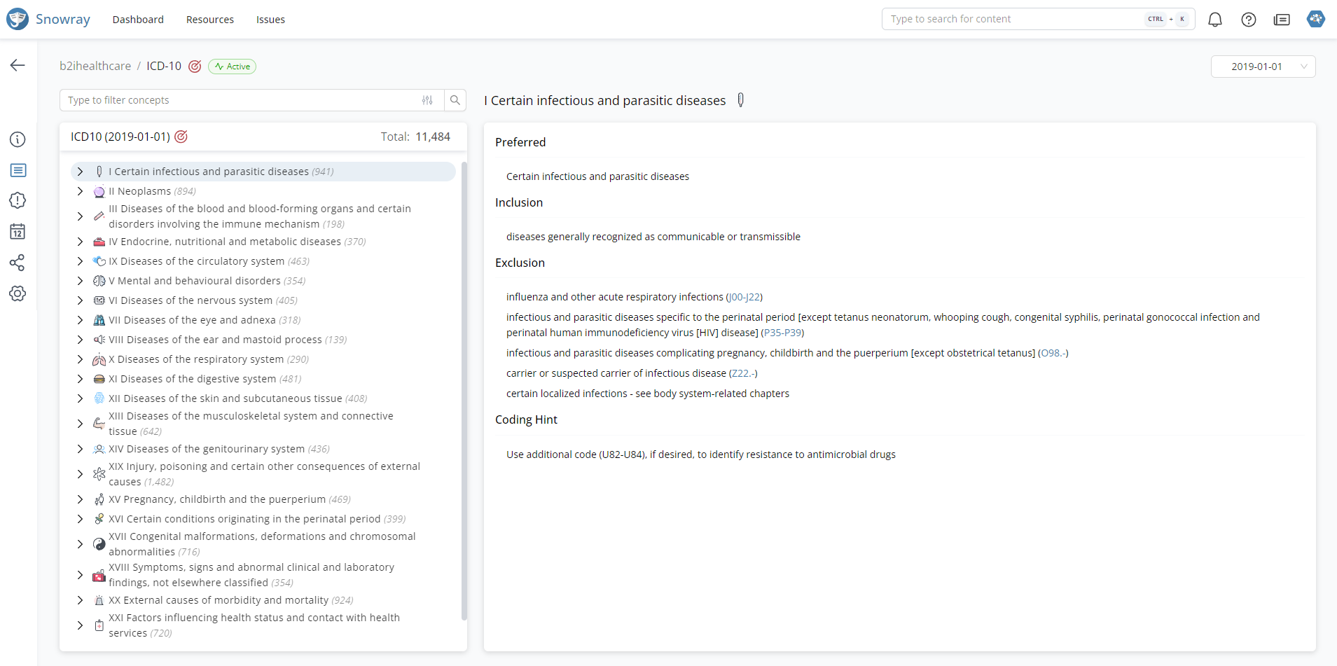Snowray supports browsing the ICD-10 terminology by providing a fully functional Browser. The terminology is represented in a hierarchical view, where the content can be browsed by expanding the nodes. ICD-10 codes can also be searched by their terms or their IDs using the filter search at the top. Search results are displayed within the hierarchy and the selected concept details next to it.