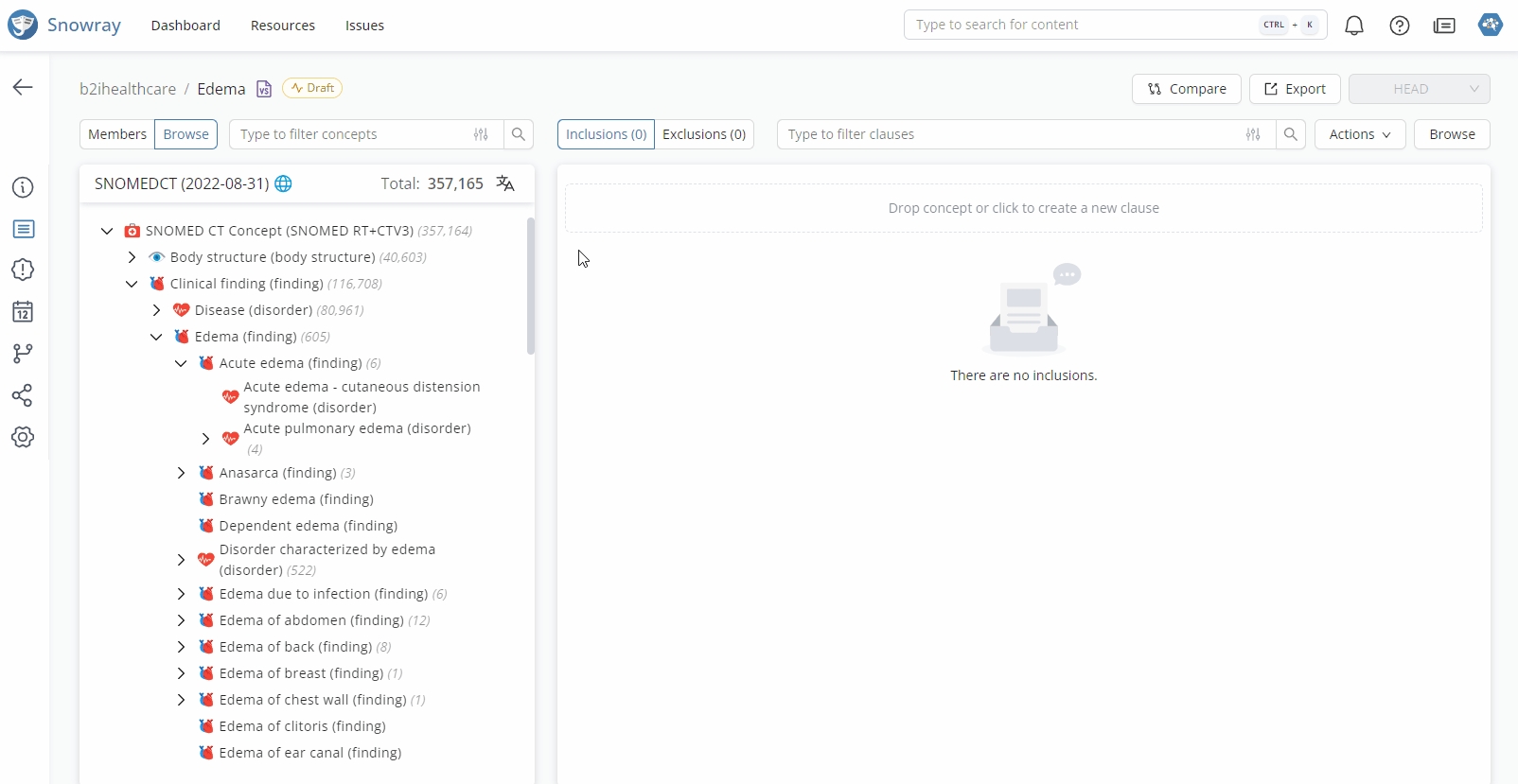 Clauses can be added by creating a query expression as well, using the basic ECL operators and the concept selector dropdown in the Basic Clause Editor: