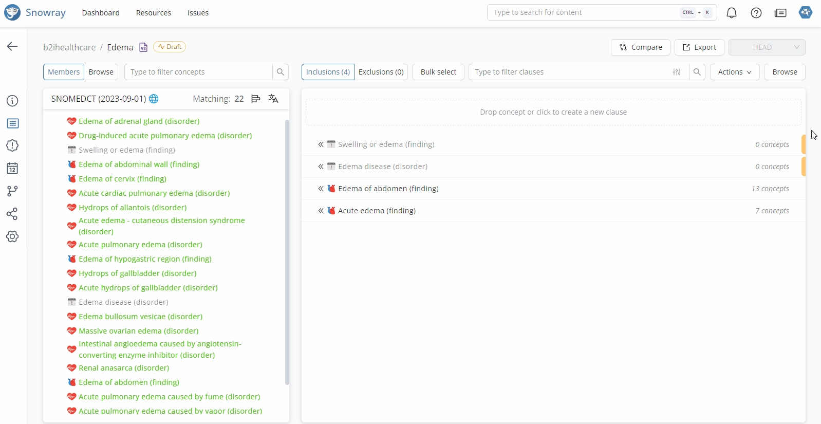 Replacements are auto-selected in case of available inactivation replacement associations. Otherwise, users can pick their preferred concepts using the quick search widget on the right-hand side.