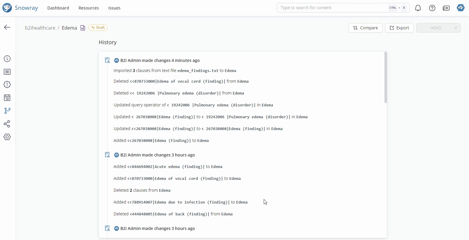 Users are allowed to restore Value Set content to a previous state. This action can be performed from the resource's History tab by hovering over a change commit and pressing the revealed button.