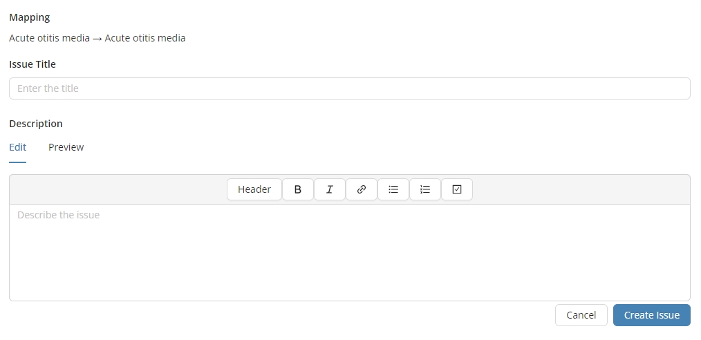 Similarly to the previous option, users can also raise issues related to specific Concept Map mappings. Hovering over a mapping will reveal the icon, pressing which creates a new issue for the mapping itself.