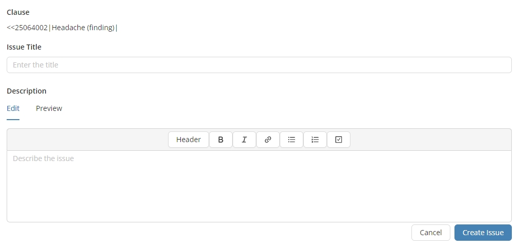 Users have the option to create issues related to specific Value Set clauses. Hovering over a clause will reveal the icon, pressing which creates a new issue for the clause itself.