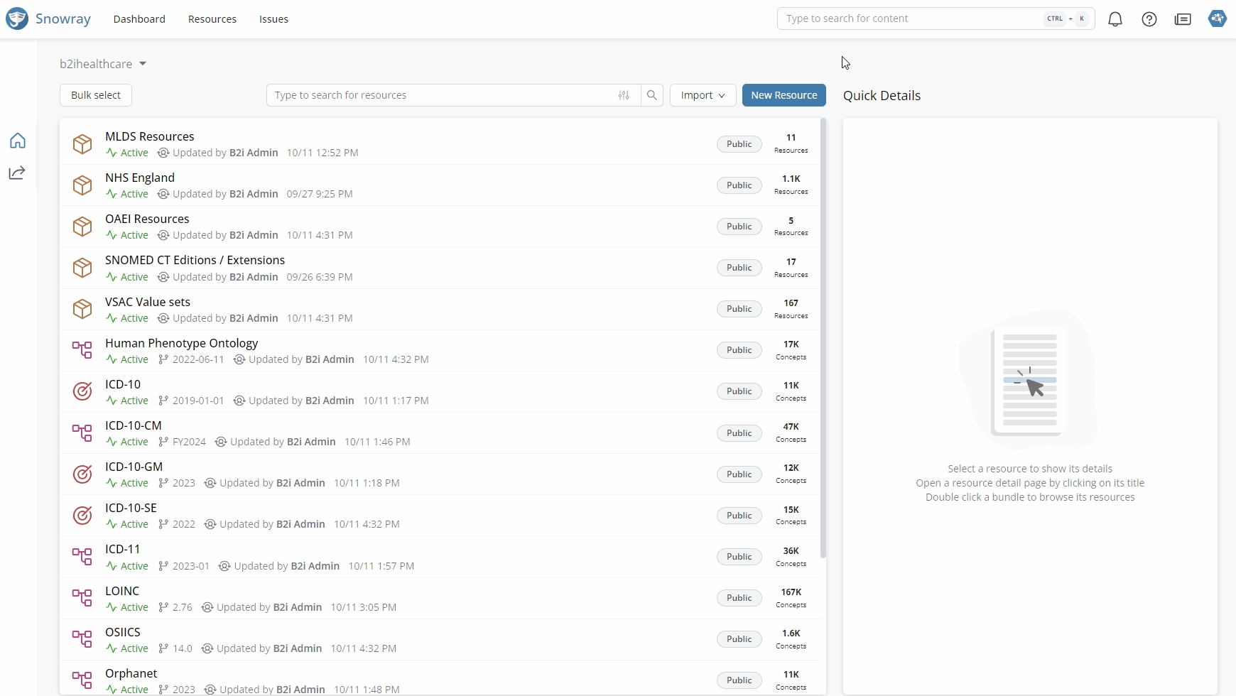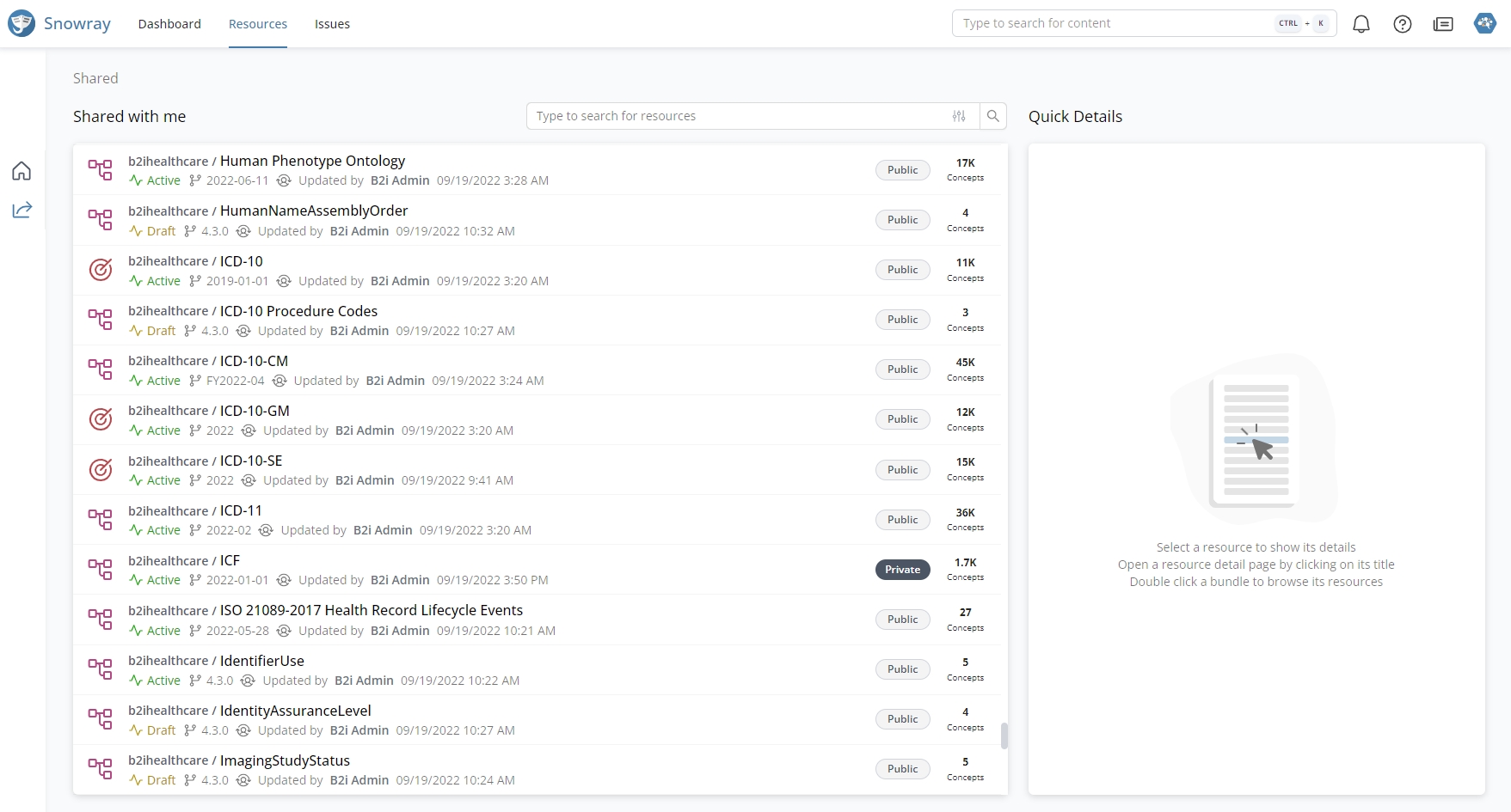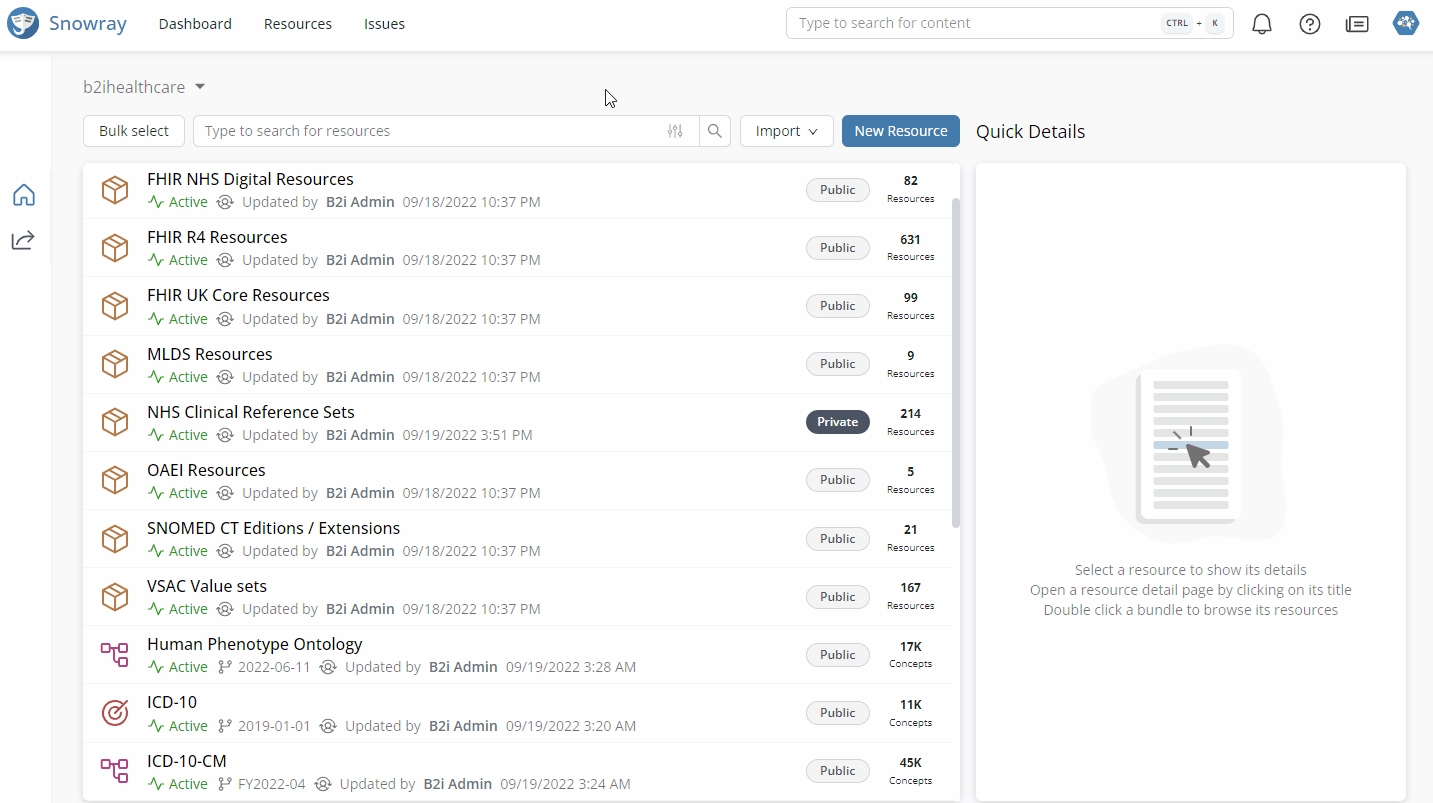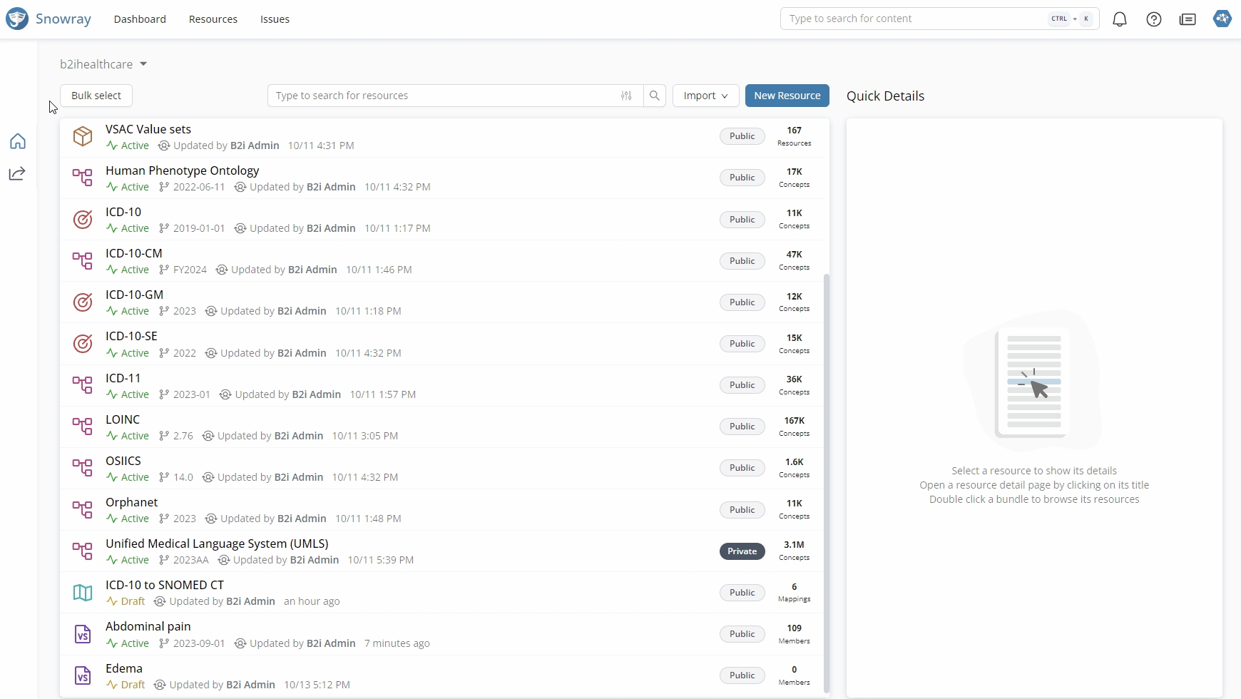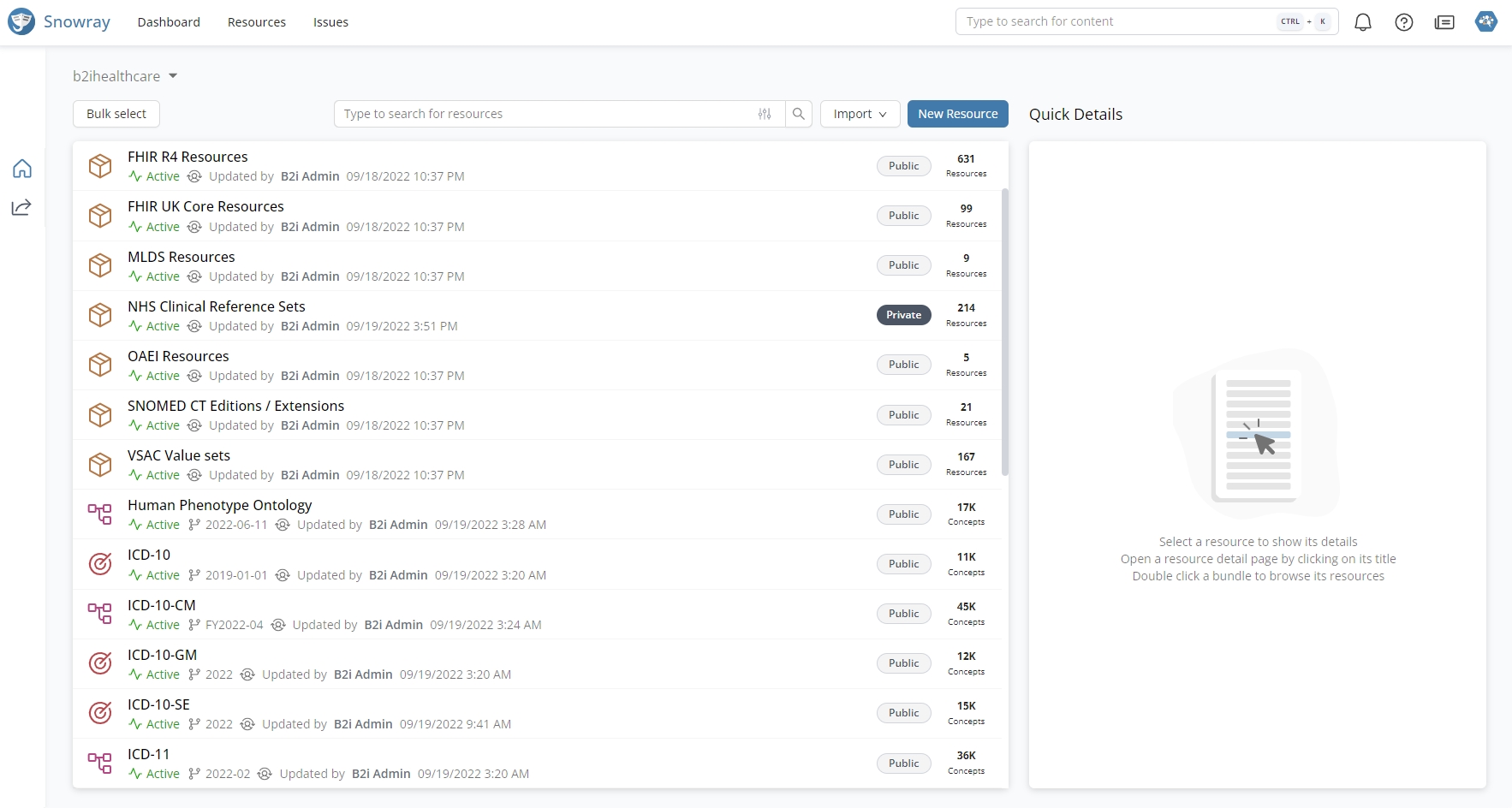 Selecting a resource will activate the Quick Details section, which will be updated with useful information about the given resource, such as ID, status, creation date, or visibility.