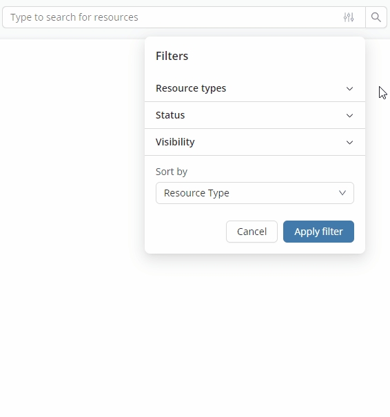 Filtering options include refinement based on Resource types, Status and Visibility.